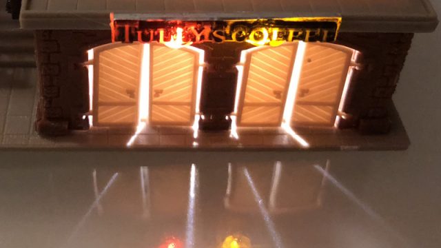 某コーヒー店の看板にはLEDを仕込んでいました。でも本物のように綺麗に光らせるのはかなり難しいのでこのくらいで諦めます。暗いと少し良い感じになります。メインのベーカリー側にもLEDを仕込んでほぼ完成です。