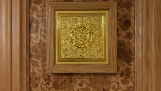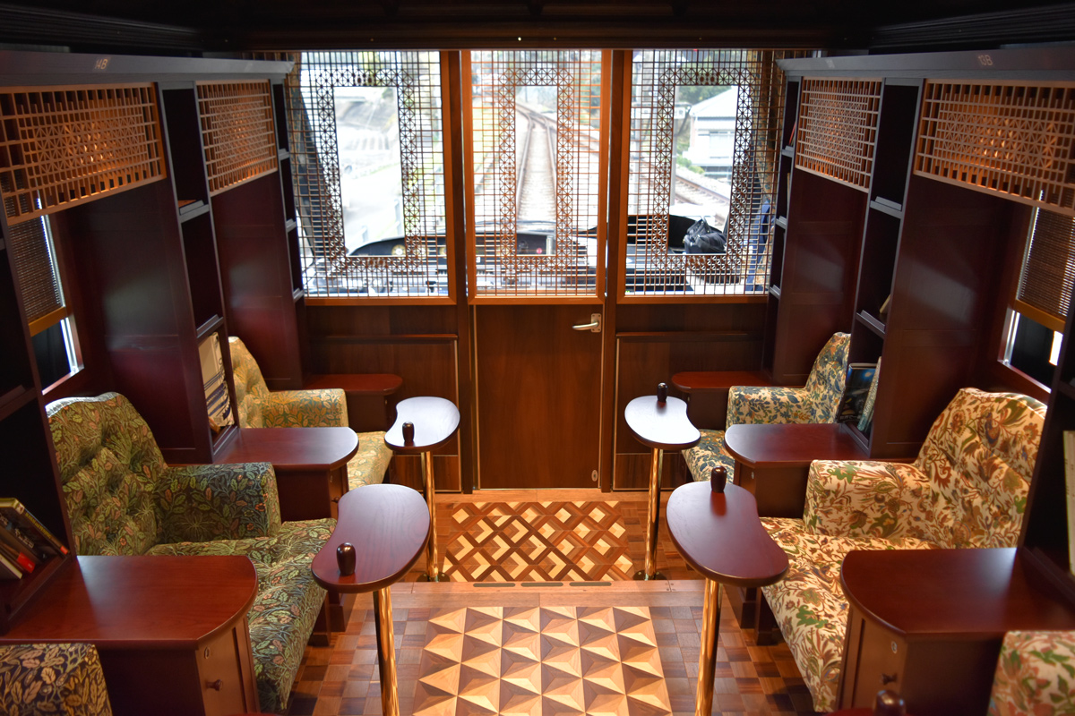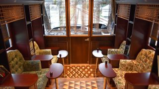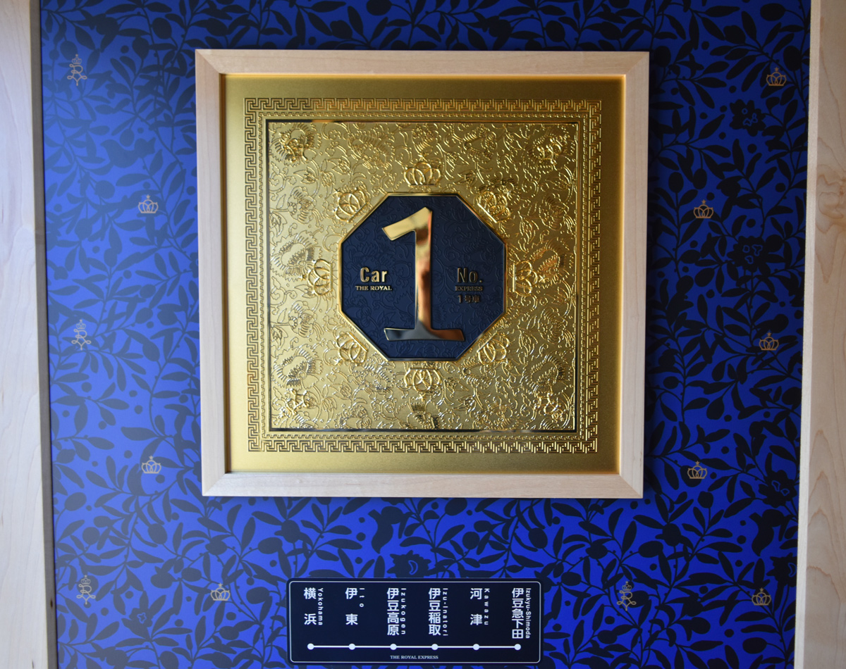 「THE ROYAL EXPRESS」の社内は木目調の車両のほかにもイベントでの利用もできる3号車は天井にロゴのあしらった金のパネルが敷き詰められています。よく見るとエアコンの吹き出し口のパネルと照明のものもあります。