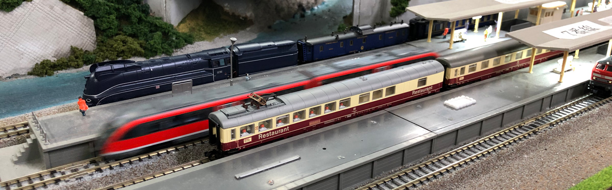 オリエント急行の車輌をトランブルーで走らせてきました。D51とEF58の重連という88年にオリエント急行が日本に来たときの機関車で牽引しています。