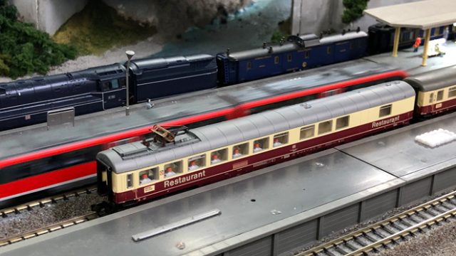 Nゲージ鉄道模型 DCC走行@レイルガーデン レンタルレイアウト「レイルガーデン」にZ21を持ち込んでDCCサウンド走行を満喫してきました。ICE 1の走行です。食堂車が1両壊れていたので1両減らしての運行です。2階立て近郊型車輌をBR218で押すヴェンデツーク走行です。 2019.03.30 Nゲージ鉄道模型