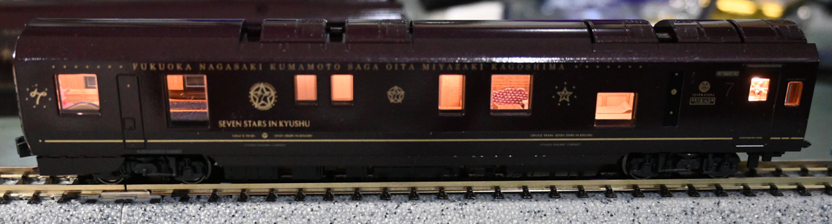 ななつ星室内ディテールアップ 7号車 Nゲージ鉄道模型 X Facebook はてブ コピー 2020.01.31 ななつ星の最も特徴的な車輌はやはり7号車の展望デッキの広い窓です。ディテールアップのあと、今回初めて人を乗せてみました。 他の車輌と異なり、シールを山折りにして貼り壁を作るなどなかなか面倒な部分が多くありました。 全て終わったかと思いきやシールが余り、よく見てみたら1号車のデッキの壁紙を貼り忘れていたので改めて分解して貼りました。
