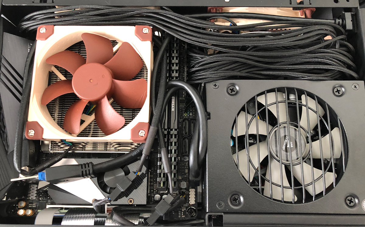 CPUファンを25mm厚のものに変更し冷却能力を向上させました。またDAN A4-SFX v4.1のフロントパネルのコネクタは19ピンのものではなくKey-Aタイプ(Type Eとも言う)なので、変換アダプタを付けますが、そのままだと電源ユニットに干渉してしまうため、25cmの延長ケーブル経由でUSB 3.2 Gen1ポートを利用できるようにします。