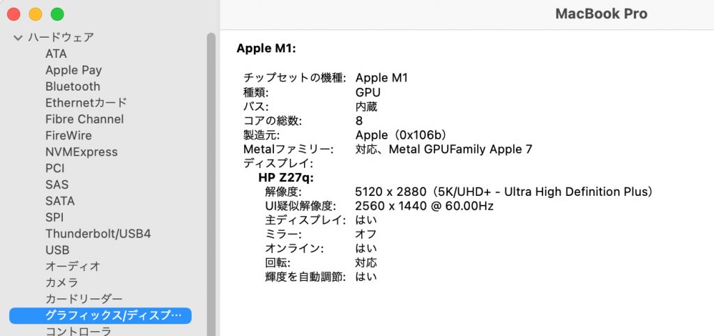 4K以上の表示は30Hzになってしまうこともあるのですが、問題なく5K@60.00Hz表示となり、全く問題なくクラムシェルモードで利用できました。