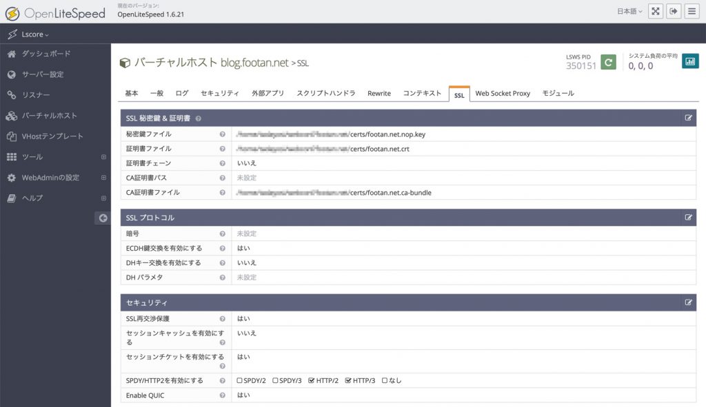 このように評価A+を取れるように設定するのが良いでしょう。このサイトでA+を取れていても数年後にはTLSのセキュリティ情勢の変化により評価Bになったりするため、時々チェックするようにしています。OpenLiteSpeedの場合、評価A+を取るための設定はとても簡単で、Web管理画面でSSLの設定を下記のようにするだけです。Apache、nginx、BIG-IPなんかで必要になるような面倒なCipher文字列の設定もいらないのはとても便利ですね。