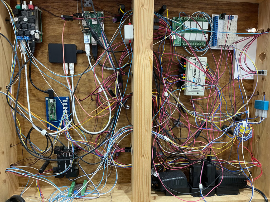Under Construction Nゲージ鉄道模型 X Facebook はてブ コピー 2022.09.172022.09.19 鉄道模型レイアウトの裏側 忙しさにかまけて5年近く放置している製作中の欧州型DCC鉄道模型レイアウトの裏側。Raspberry piを2台使ってUSBシリアルで建物の明かりを制御できるようにしたほかポイントや腕木式信号の制御用モジュールとかいろいろあって、もう自分でも配線が分からなくてこれに加えて200本くらい配線を追加すると思うとなかなか憂鬱。シルバーウィークは雨模様らしいので少し進めてみようかな。