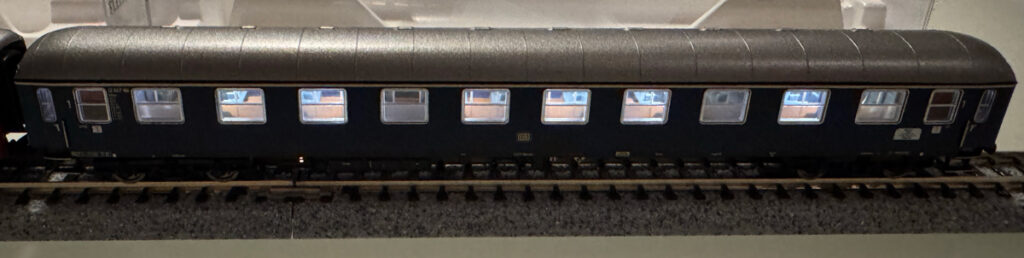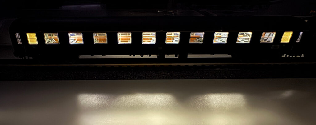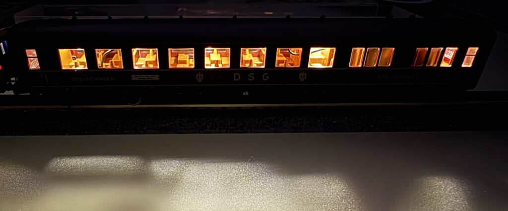 側面から照らして導光板で照らすのではなく、実車に近く天井から小さなLEDが複数個下向きに照らす形になるため、光り方もよりリアルなだけでなく、基板に小さなボリュームつまみみたいなものが付いていて個別に明るさを調節できるなど、模型ひとつでも芸の細かさがさすがドイツという感じです。